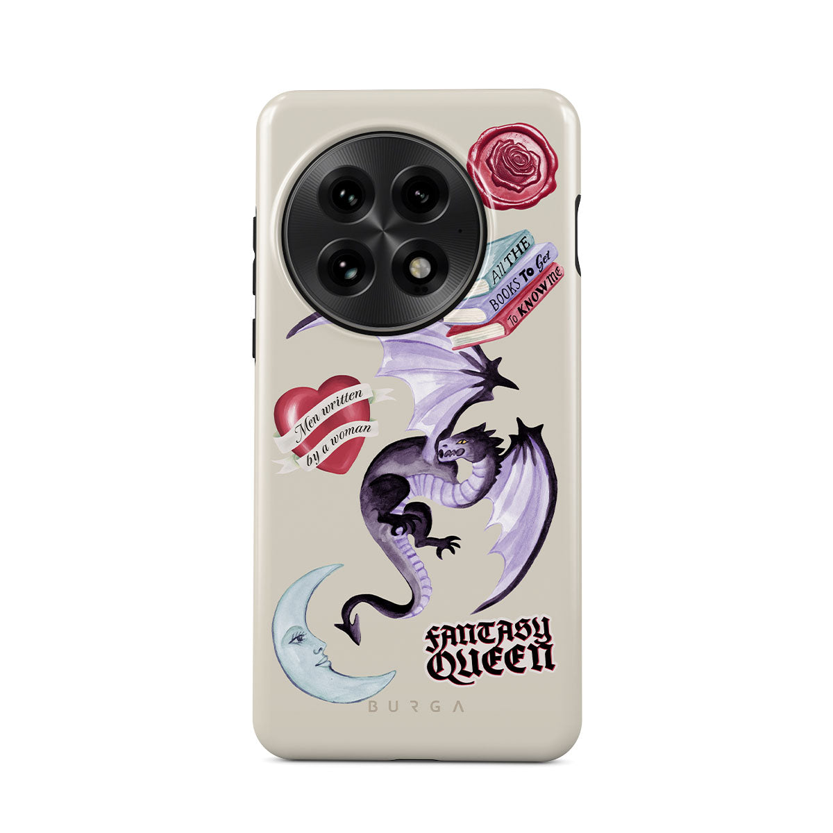 This design features: purple dragon, "Fantasy Queen" sticker, crescent moon, purple wax seal, heart with message, books