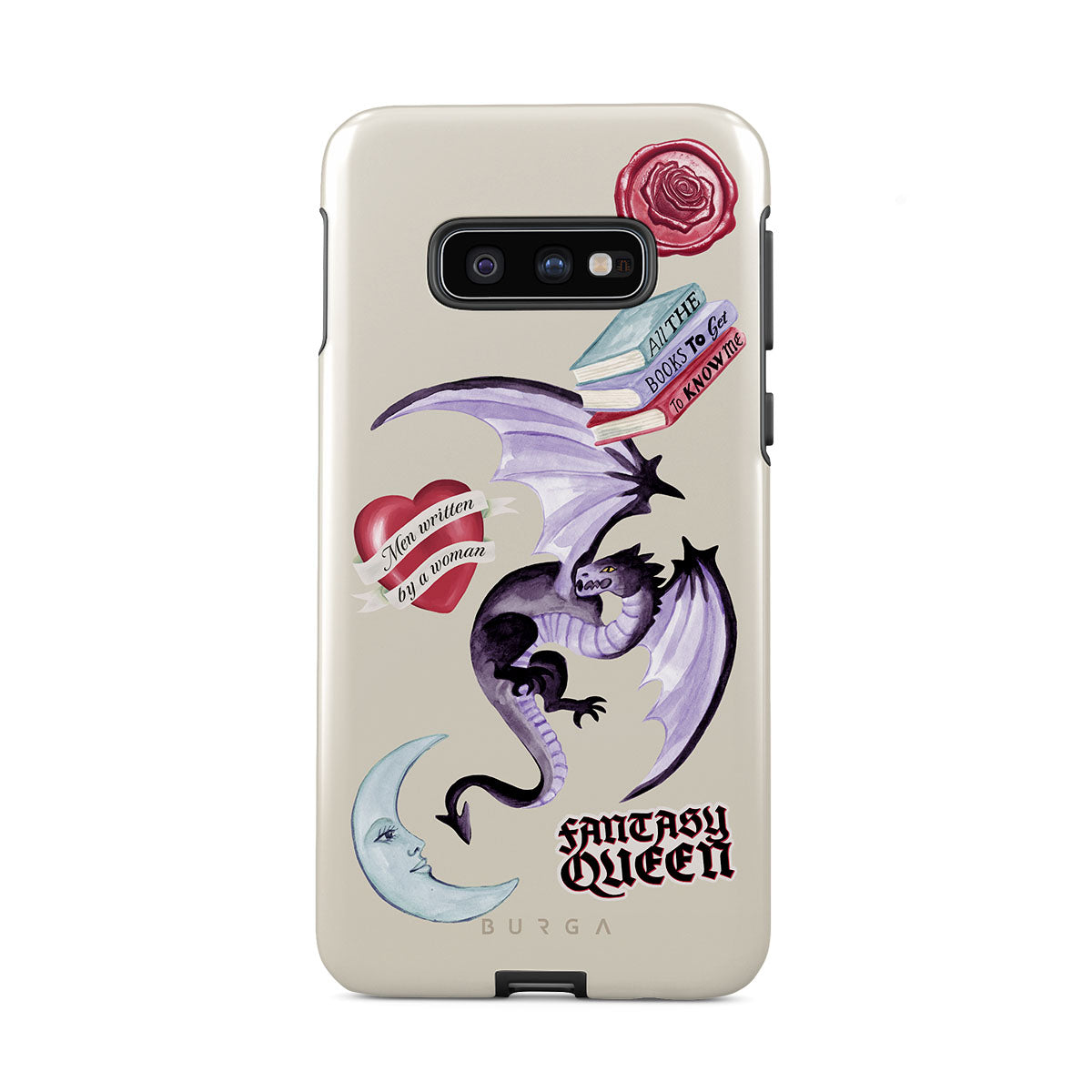This design features: purple dragon, "Fantasy Queen" sticker, crescent moon, purple wax seal, heart with message, books