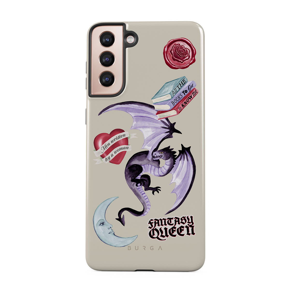 This design features: purple dragon, "Fantasy Queen" sticker, crescent moon, purple wax seal, heart with message, books