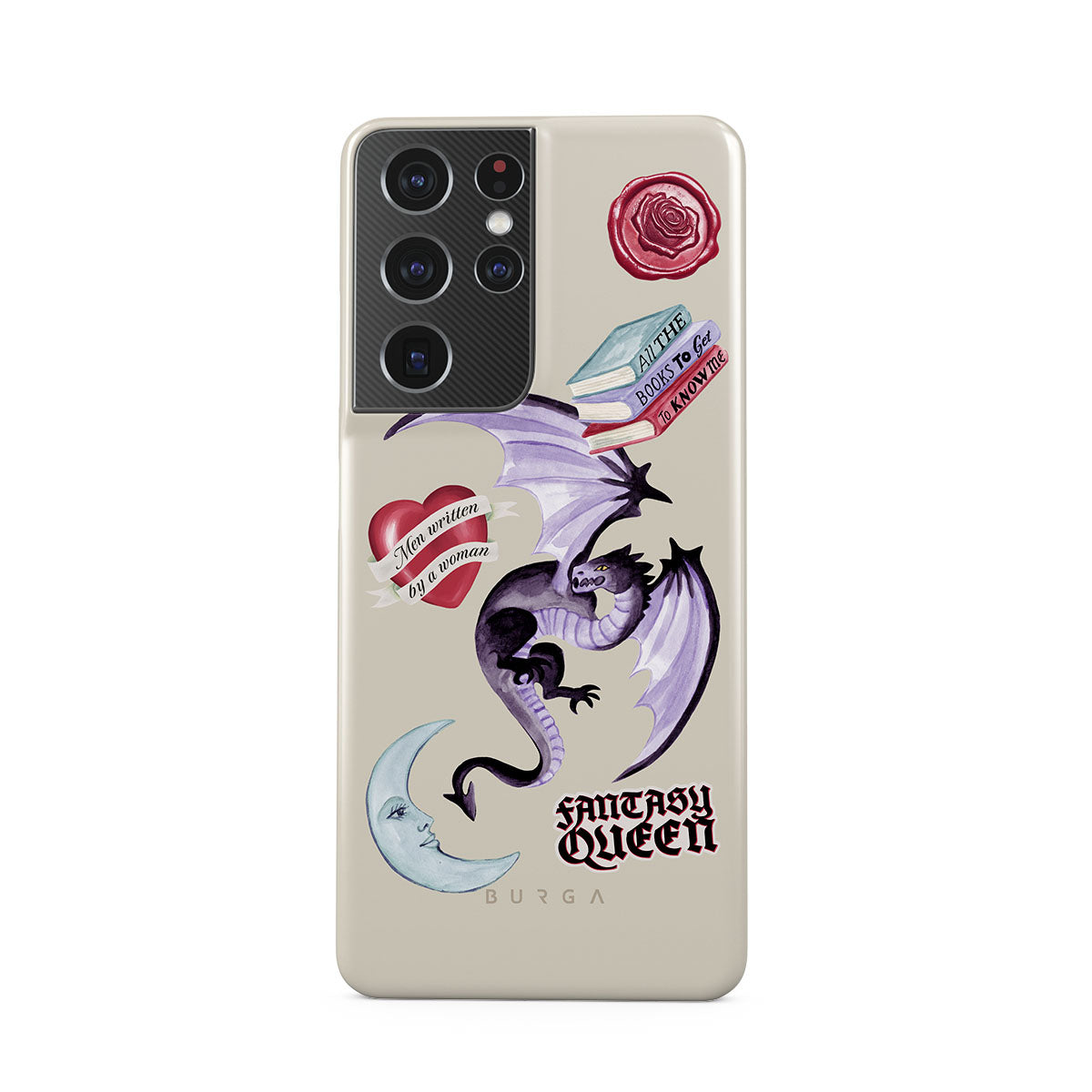 This design features: purple dragon, "Fantasy Queen" sticker, crescent moon, purple wax seal, heart with message, books