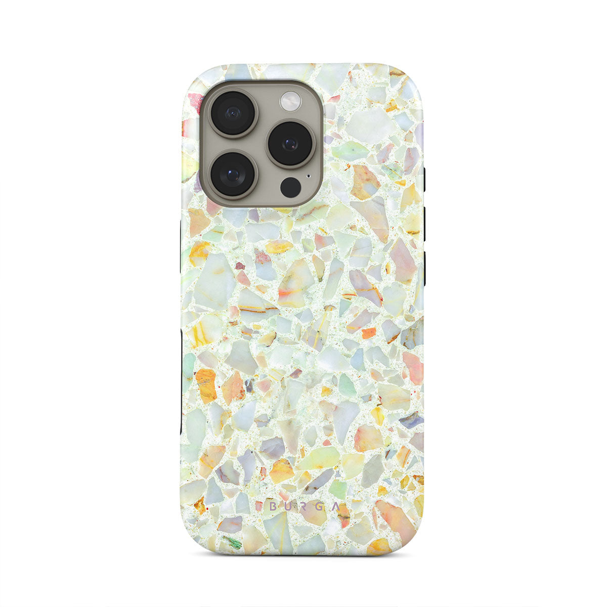 Sun is shining bright, creating rainbows on the path as the light and warm rain just washed the tiles. Walk around barefoot and feel the magic in your steps. Take this summery feeling encased in a cute iPhone 16 Pro phone case that is as protective as mesmerizing the rainbow can be.