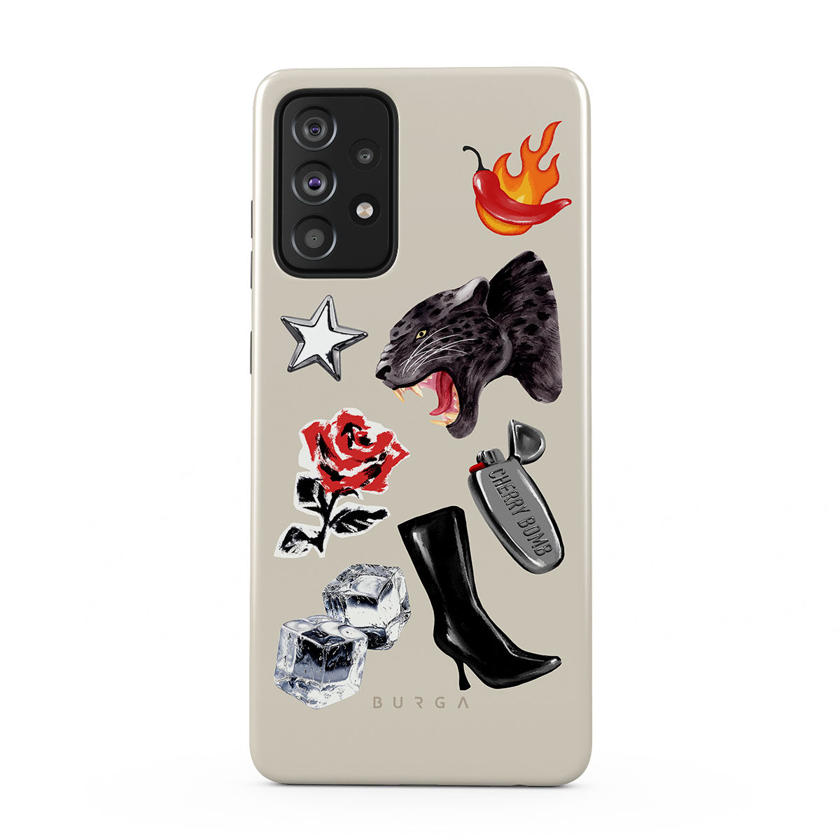 This design features: black panther, red rose, burning bell pepper, silver lighter, black knee-high boots, ice cubes, silver star