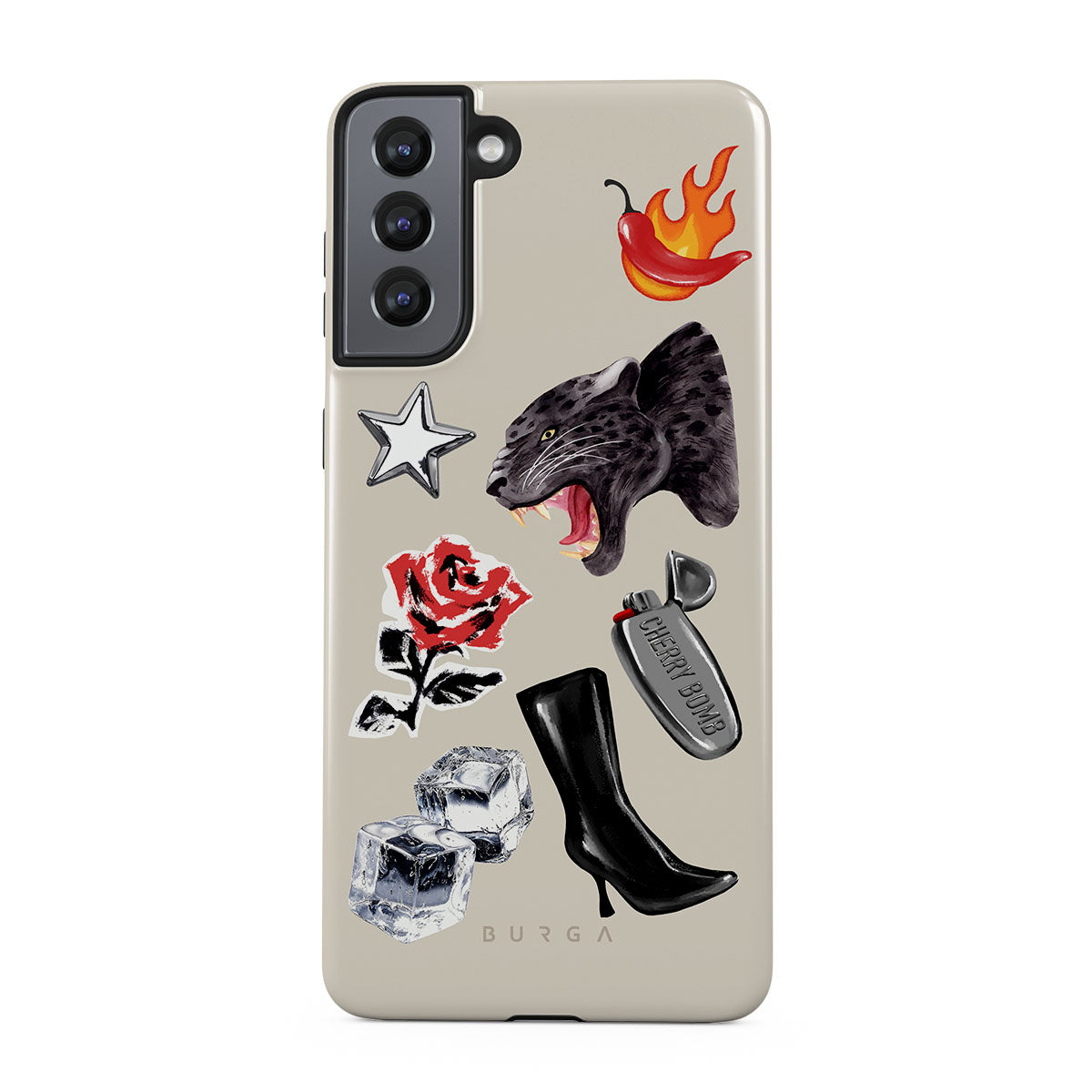 This design features: black panther, red rose, burning bell pepper, silver lighter, black knee-high boots, ice cubes, silver star