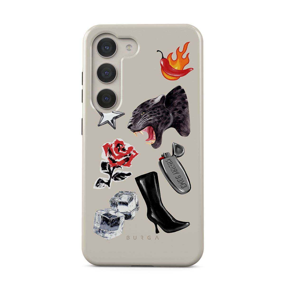 This design features: black panther, red rose, burning bell pepper, silver lighter, black knee-high boots, ice cubes, silver star