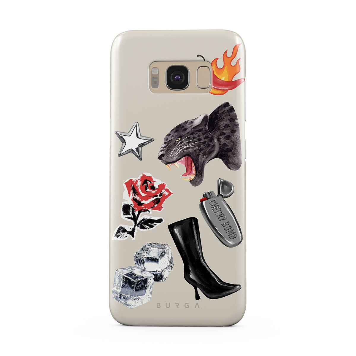 This design features: black panther, red rose, burning bell pepper, silver lighter, black knee-high boots, ice cubes, silver star