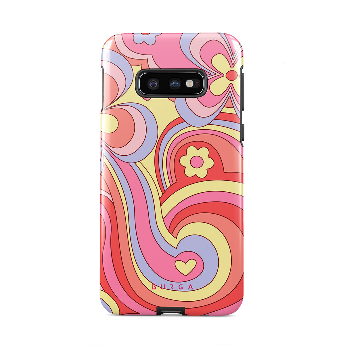 A design embodying a radiant, cheerful life filled with hope and joy. A celebration in hues, a mix of vibrant pink, yellow, and blue swirls. Roller Disco is where fashion meets fun. With beautiful pastels blending into a head-turning style, every day feels like a party. Spin your Samsung Galaxy S10E phone case into the spotlight!