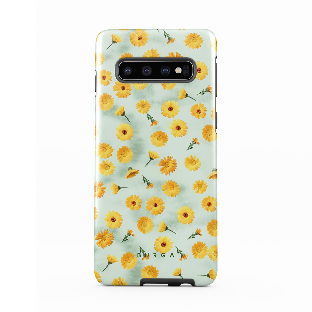 In our Sanctuary of Love Samsung Galaxy S10 phone case, a soft mint marble meets a glowing pattern of yellow flowers that will surely add a splash of energy to your style while protecting your phone from dangerous falls.