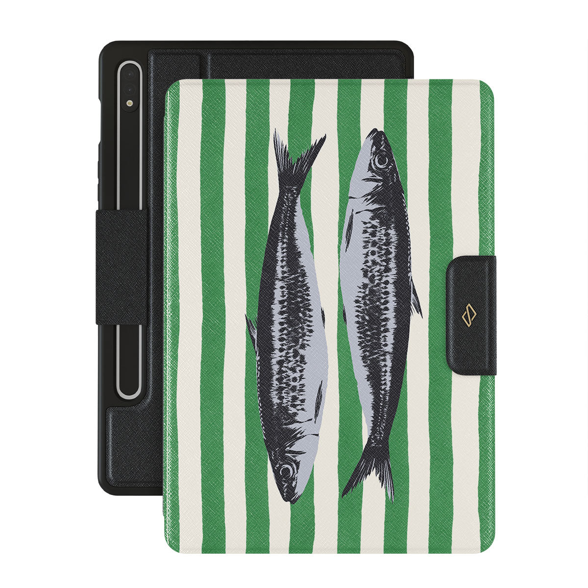 It’s like you’re riding a wave on a flamingo float, heading straight for a beach bar. This Samsung Galaxy Tab S8+/S7+/S7 FE folio case design is sardines, stripes, and sunshine in the same breath—chaotic, cool, and ready to drop that vacation vibe. Can you smell the sea breeze yet?