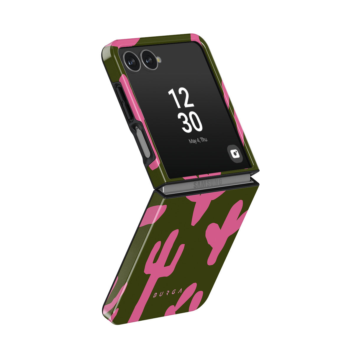 Step into a desert oasis at dusk, where vibrant pink cactuses bloom against a mysterious dark background. Serenade is a poetic fusion of resilience and beauty, turning your Samsung Galaxy Z Flip 7 phone case into a sanctuary of tranquility amidst the chaos of everyday life.