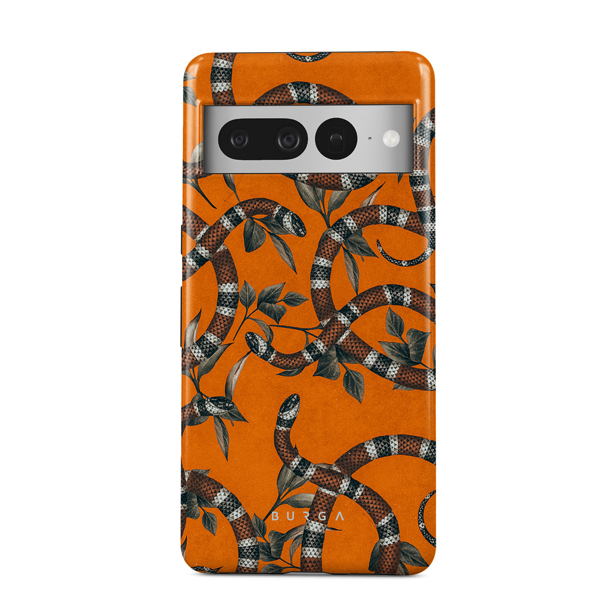 Take a bit of fierceness with yourself with our bright orange and dangerously beautiful Google Pixel 7 Pro phone case with a snake pattern. This case is real eye candy for fashion lovers and just as needed for those who strive to keep their phones protected.