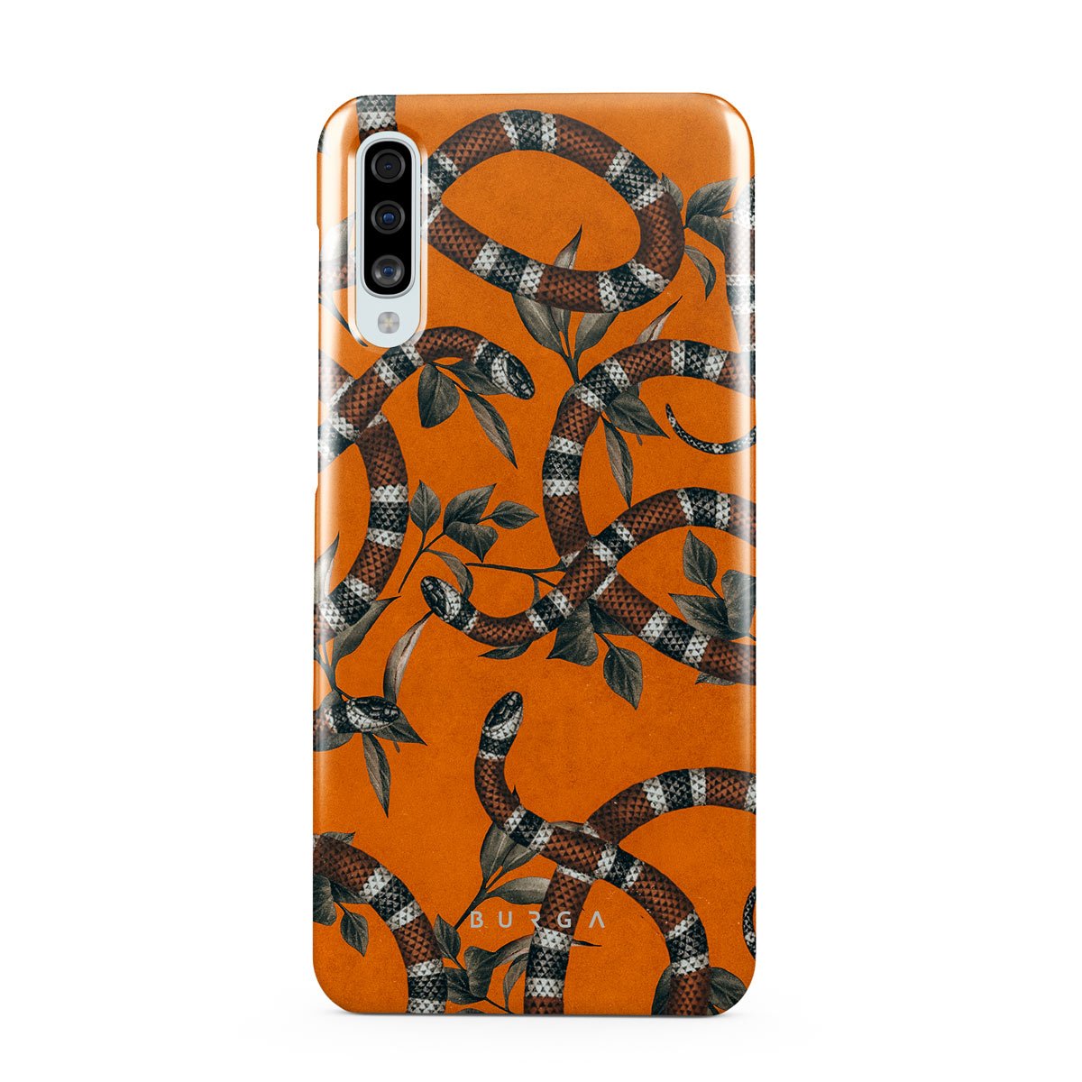 Take a bit of fierceness with yourself with our bright orange and dangerously beautiful Samsung Galaxy A50 phone case with a snake pattern. This case is real eye candy for fashion lovers and just as needed for those who strive to keep their phones protected.