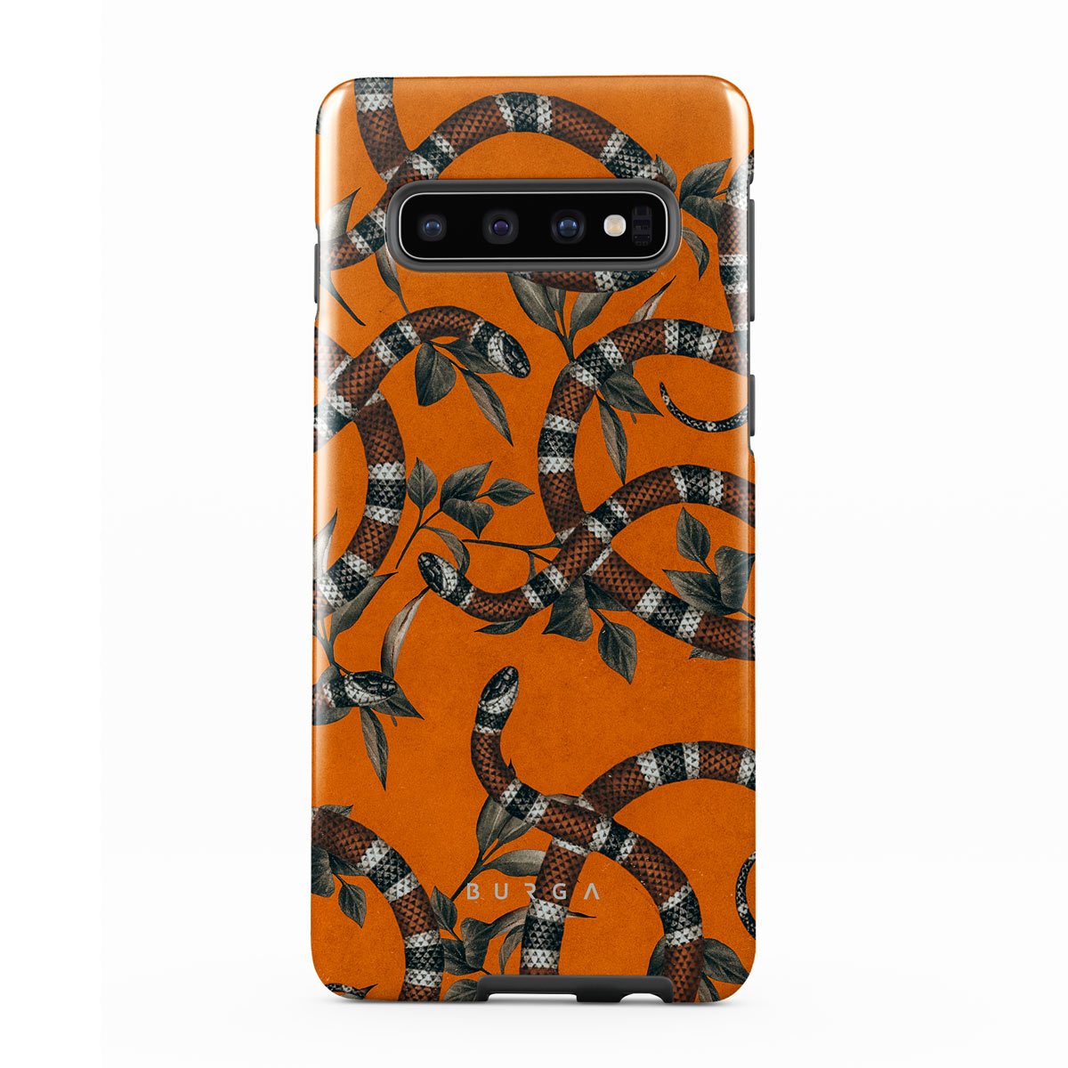 Take a bit of fierceness with yourself with our bright orange and dangerously beautiful Samsung Galaxy S10 phone case with a snake pattern. This case is real eye candy for fashion lovers and just as needed for those who strive to keep their phones protected.
