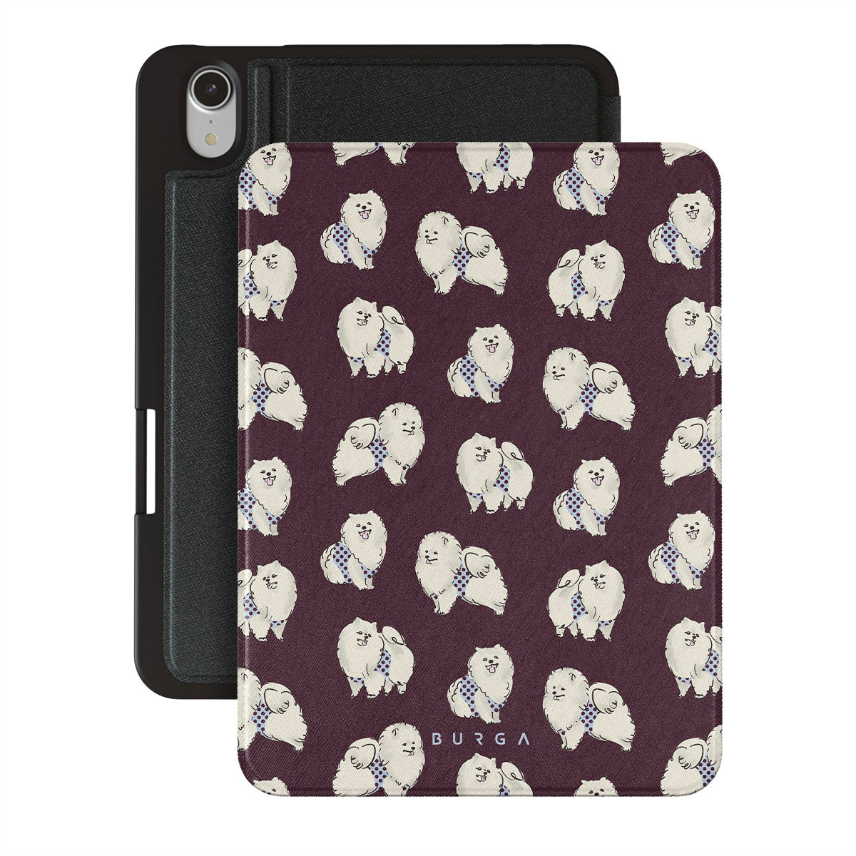 This design features: white fluffy dogs on a deep burgundy background, poodles, pets.