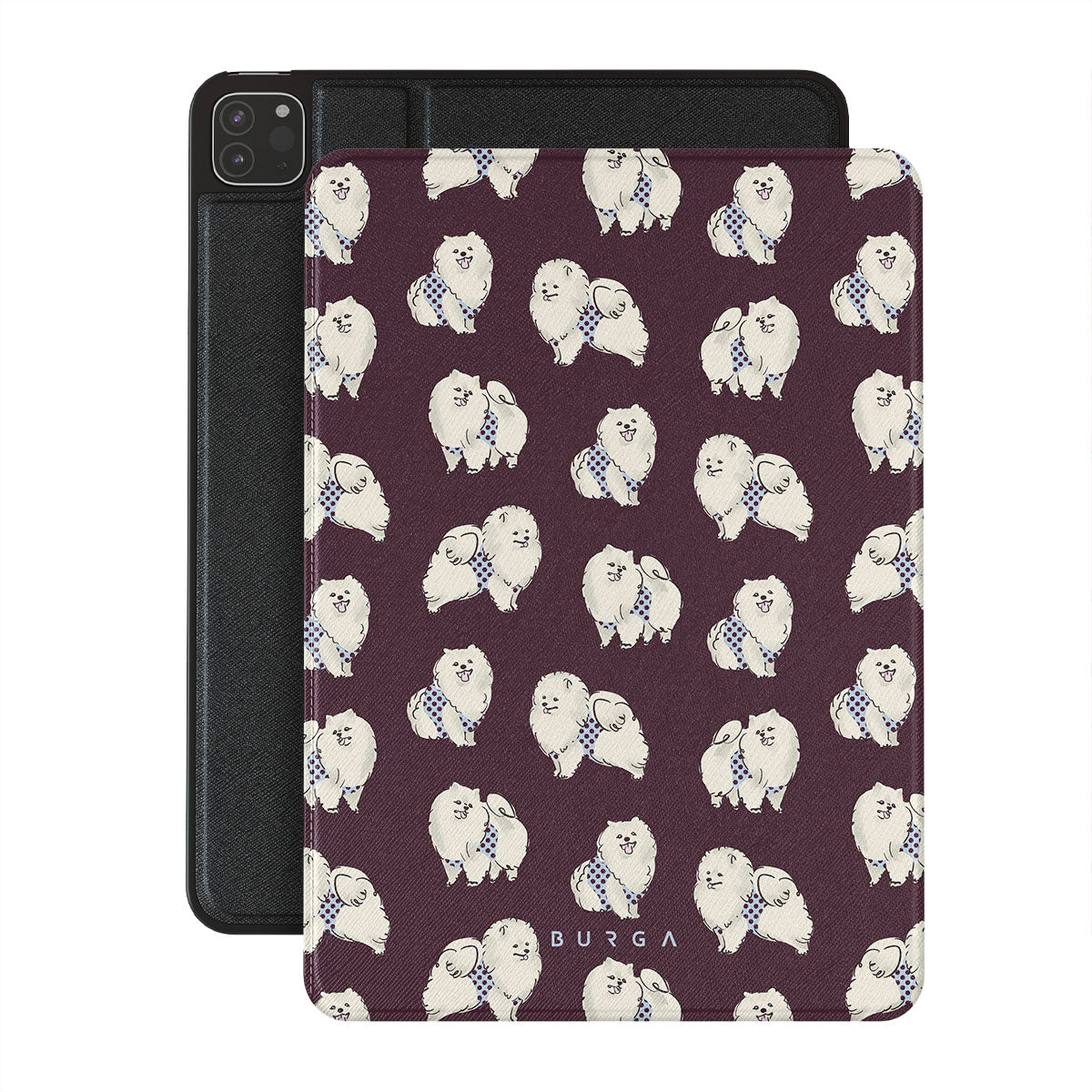 This design features: white fluffy dogs on a deep burgundy background, poodles, pets.