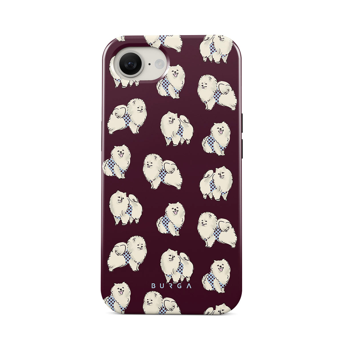 This design features: white fluffy dogs on a deep burgundy background, poodles, pets.