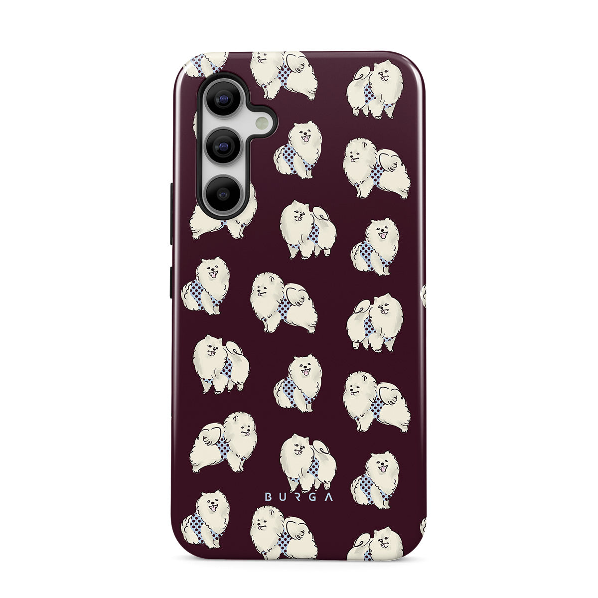 This design features: white fluffy dogs on a deep burgundy background, poodles, pets.