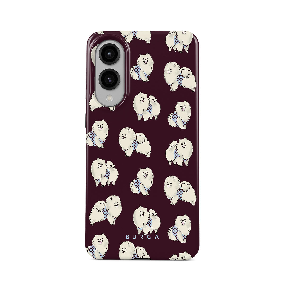 This design features: white fluffy dogs on a deep burgundy background, poodles, pets.