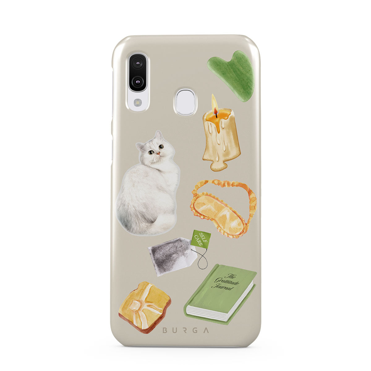 This design features: white cat, green book, candle, Gua Sha bar, sleeping mask, tea bag, yellow crystal