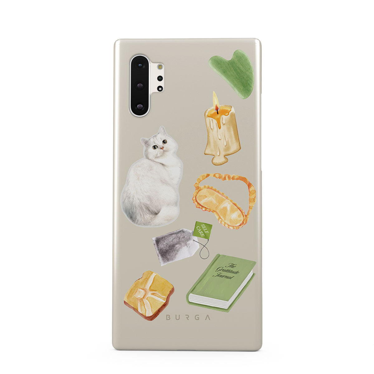 This design features: white cat, green book, candle, Gua Sha bar, sleeping mask, tea bag, yellow crystal