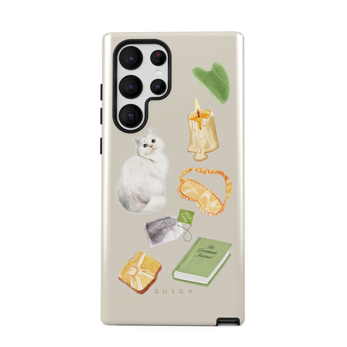 This design features: white cat, green book, candle, Gua Sha bar, sleeping mask, tea bag, yellow crystal
