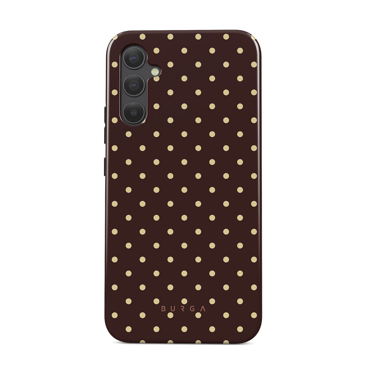 Playful yet polished, our Sorry Busy Samsung Galaxy A34 phone case design features a warm brown background sprinkled with delicate beige polka dots, blending charm with a professional edge. It's for those who keep it stylish, even when fully booked and thriving.