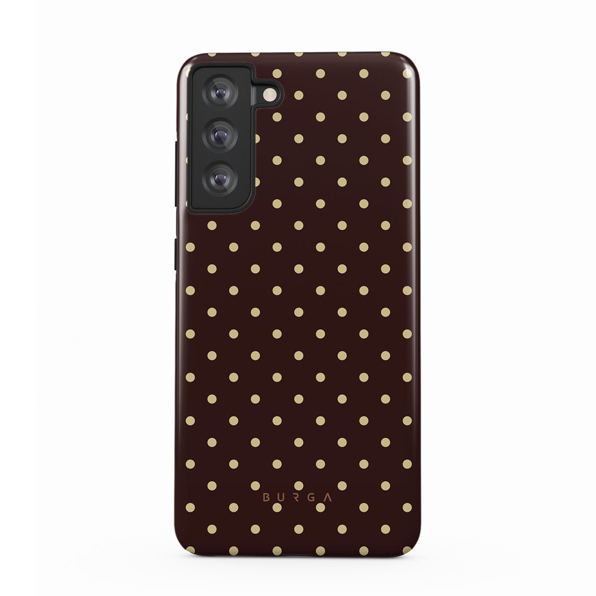 Playful yet polished, our Sorry Busy Samsung Galaxy S21 FE phone case design features a warm brown background sprinkled with delicate beige polka dots, blending charm with a professional edge. It's for those who keep it stylish, even when fully booked and thriving.