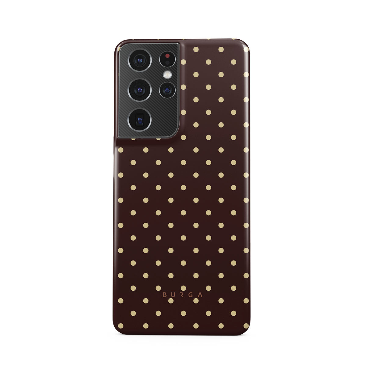 Playful yet polished, our Sorry Busy Samsung Galaxy S21 Ultra phone case design features a warm brown background sprinkled with delicate beige polka dots, blending charm with a professional edge. It's for those who keep it stylish, even when fully booked and thriving.