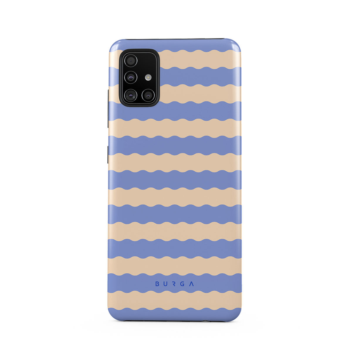 Dive into the cool, refreshing style of our Splash design–a dynamic Samsung Galaxy A71 4G phone case featuring playful, wavy stripes of serene ocean blue and soft sandy beige. Perfect for those who love to make a splash with their accessories.