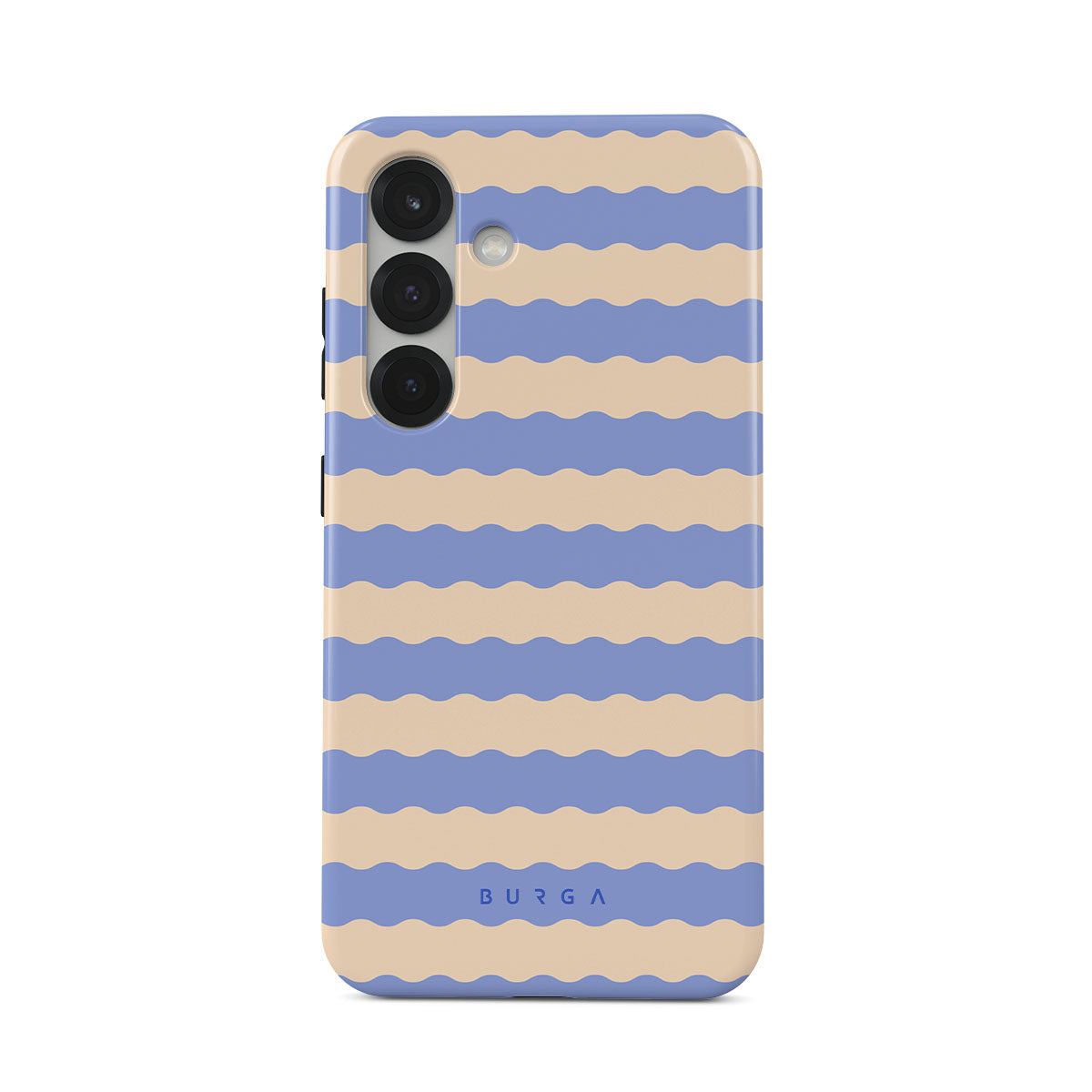 Dive into the cool, refreshing style of our Splash design–a dynamic Samsung Galaxy S25 phone case featuring playful, wavy stripes of serene ocean blue and soft sandy beige. Perfect for those who love to make a splash with their accessories.