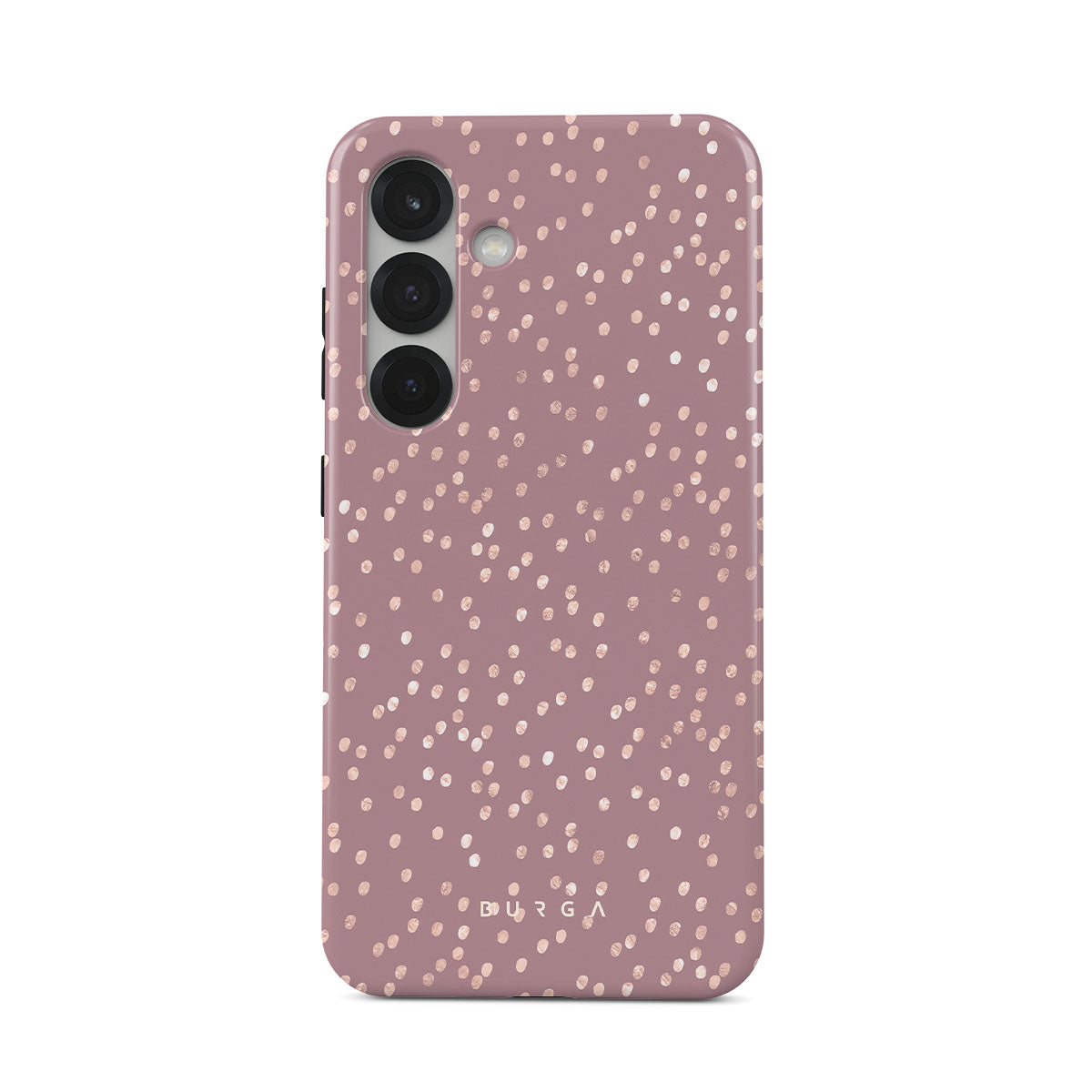 Trendy mauve color as a background for the gold-colored spots creates true beauty. Make your Samsung Galaxy S25 stand out with our protective and pretty Hot Cocoa phone case. The spotted pattern adds a touch of luxury to your phone, while the case's hard-shell nature offers much-needed protection.