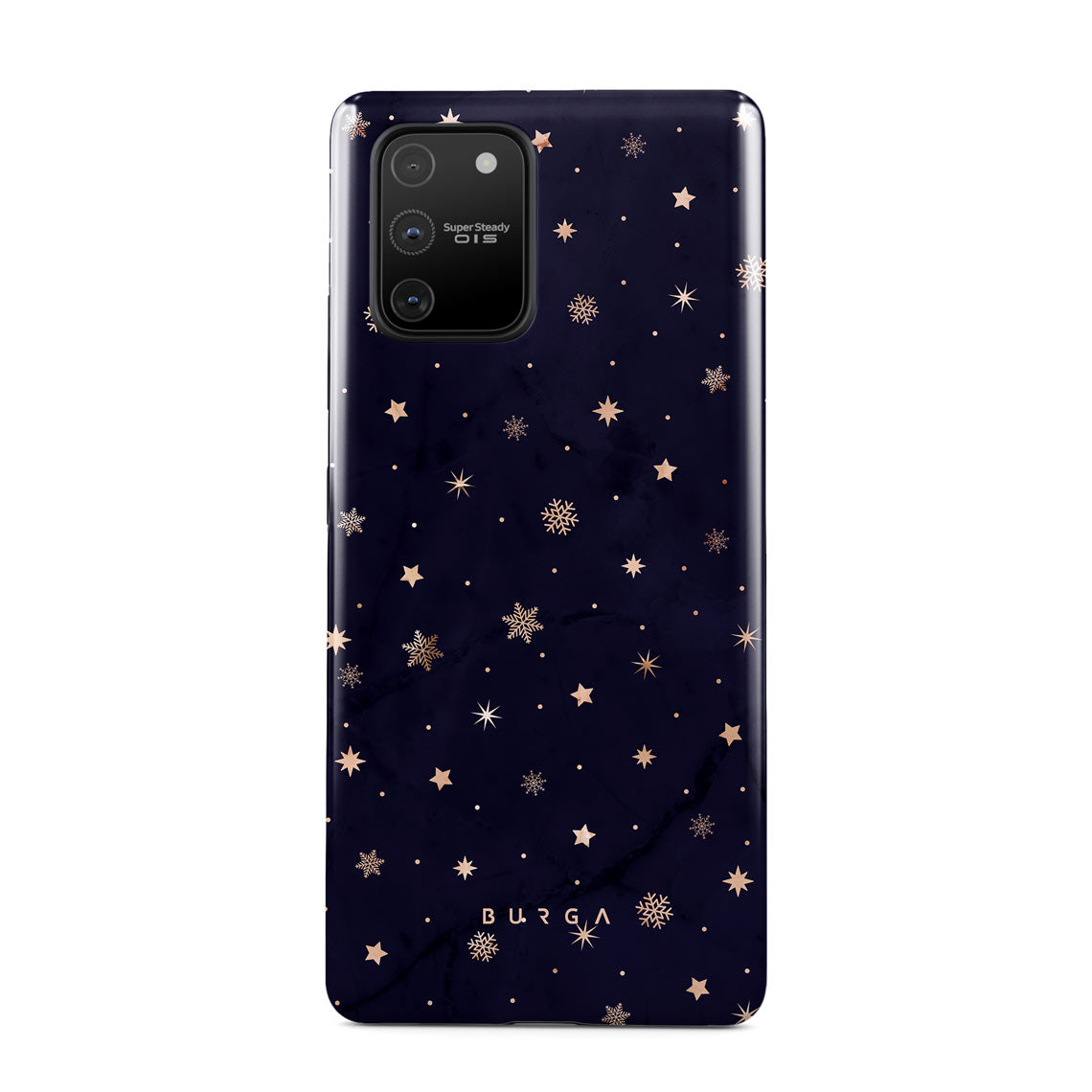 With a dreamy combination of dark blue and golden colors in the pretty star pattern found in our Midnight Kiss Samsung Galaxy S10 Lite phone case, you can protect your phone and add a magical feel to it just in one go.