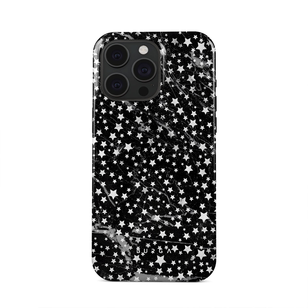 iPhone 15 Pro Max phone case is inspired by the sky above us. Here the charming star pattern meets with a trendy black and white marble. Add the unique combination to your wardrobe and transform your protective phone case into a fashion accessory.