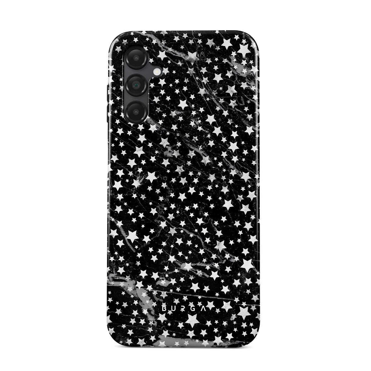 Samsung Galaxy A25 phone case is inspired by the sky above us. Here the charming star pattern meets with a trendy black and white marble. Add the unique combination to your wardrobe and transform your protective phone case into a fashion accessory.