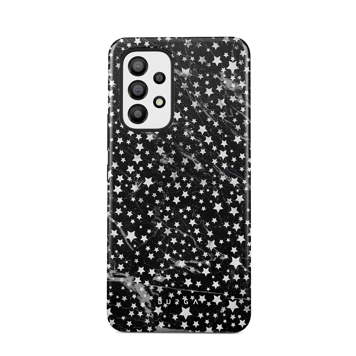 Samsung Galaxy A72 phone case is inspired by the sky above us. Here the charming star pattern meets with a trendy black and white marble. Add the unique combination to your wardrobe and transform your protective phone case into a fashion accessory.