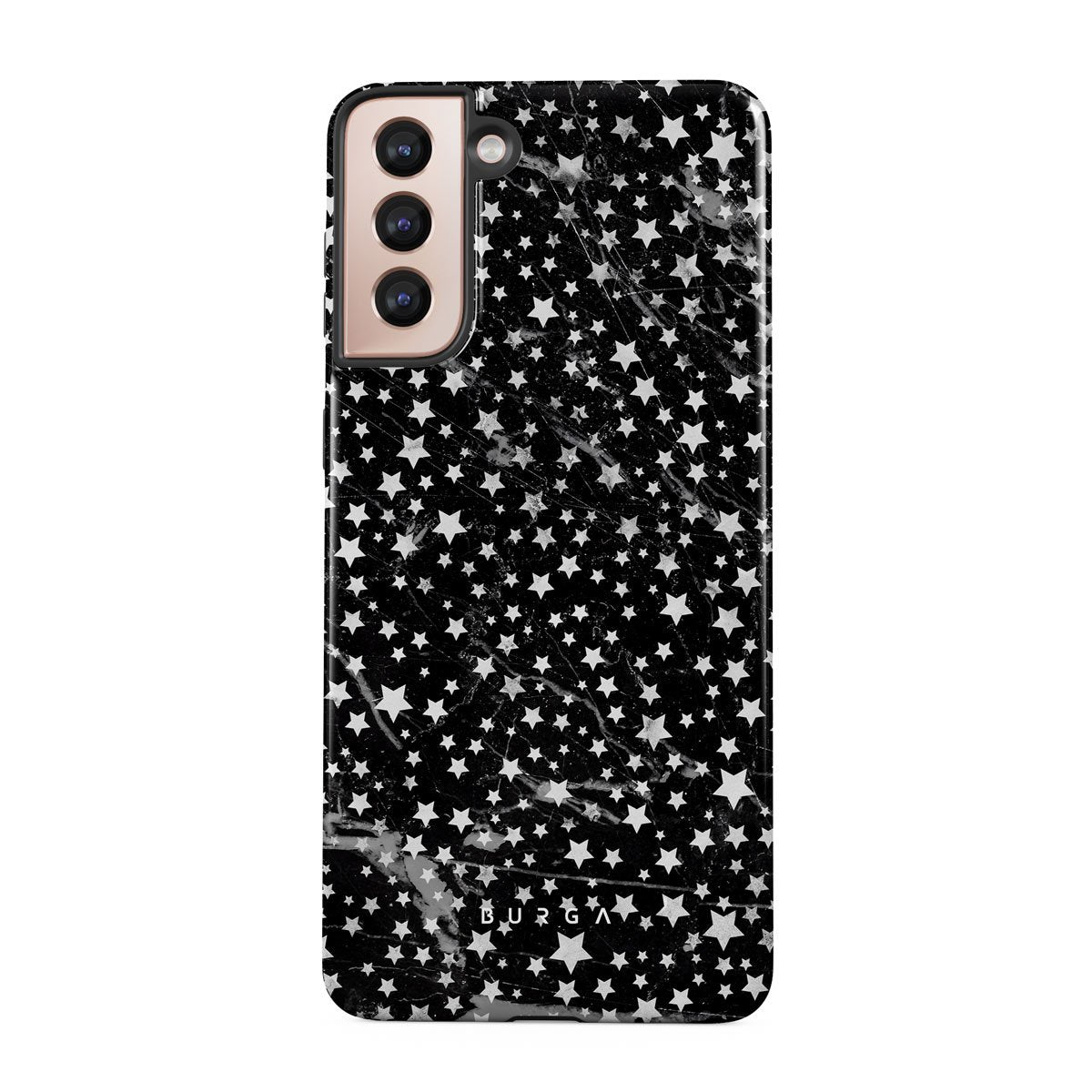 Samsung Galaxy S21 Plus phone case is inspired by the sky above us. Here the charming star pattern meets with a trendy black and white marble. Add the unique combination to your wardrobe and transform your protective phone case into a fashion accessory.