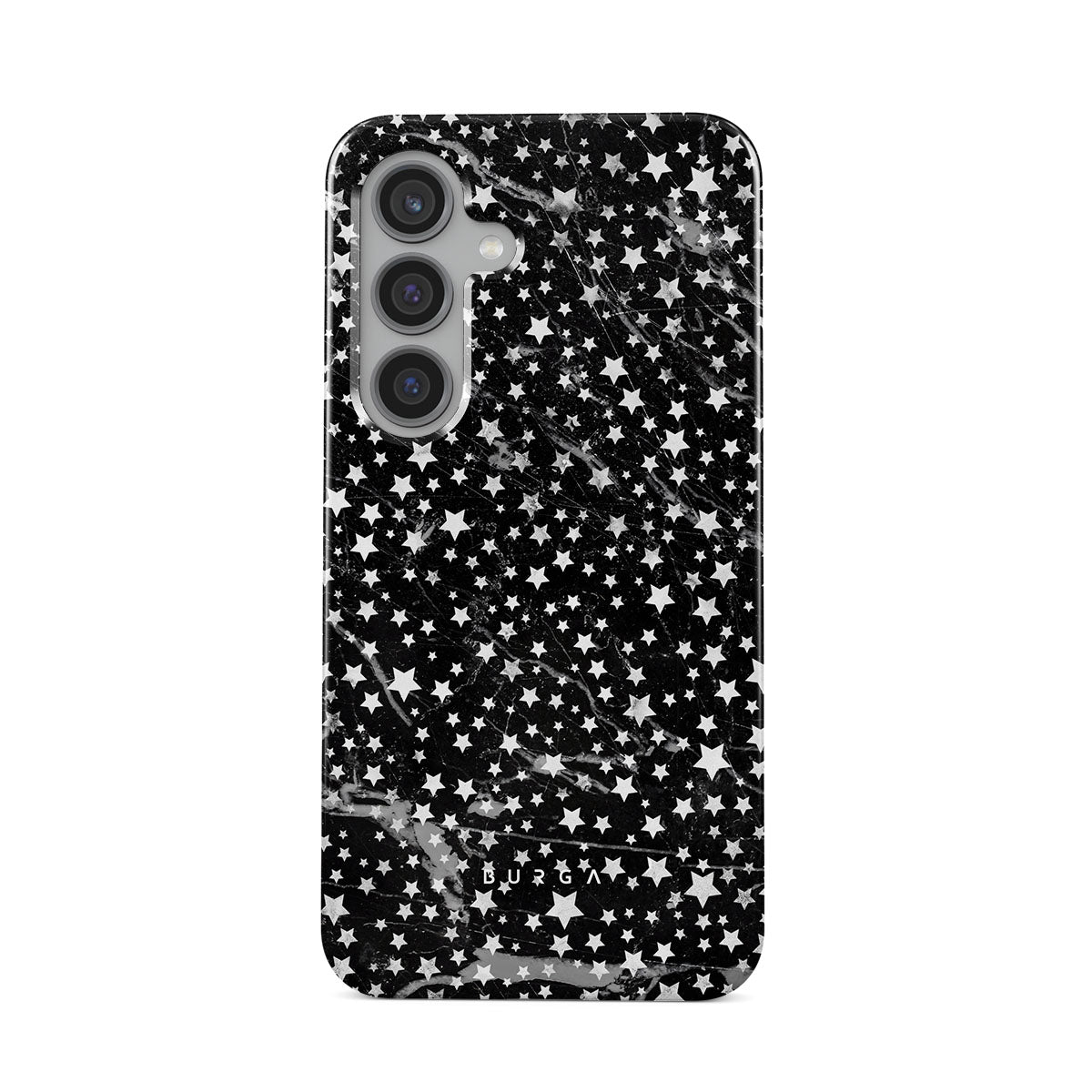 Samsung Galaxy S24 Plus phone case is inspired by the sky above us. Here the charming star pattern meets with a trendy black and white marble. Add the unique combination to your wardrobe and transform your protective phone case into a fashion accessory.