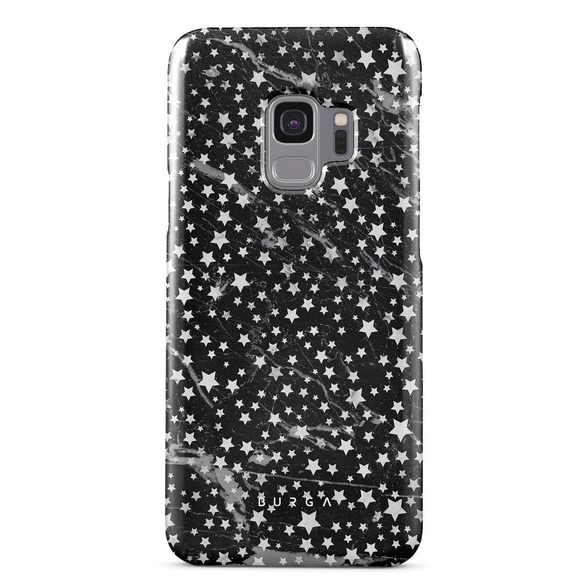 Samsung Galaxy S9 phone case is inspired by the sky above us. Here the charming star pattern meets with a trendy black and white marble. Add the unique combination to your wardrobe and transform your protective phone case into a fashion accessory.