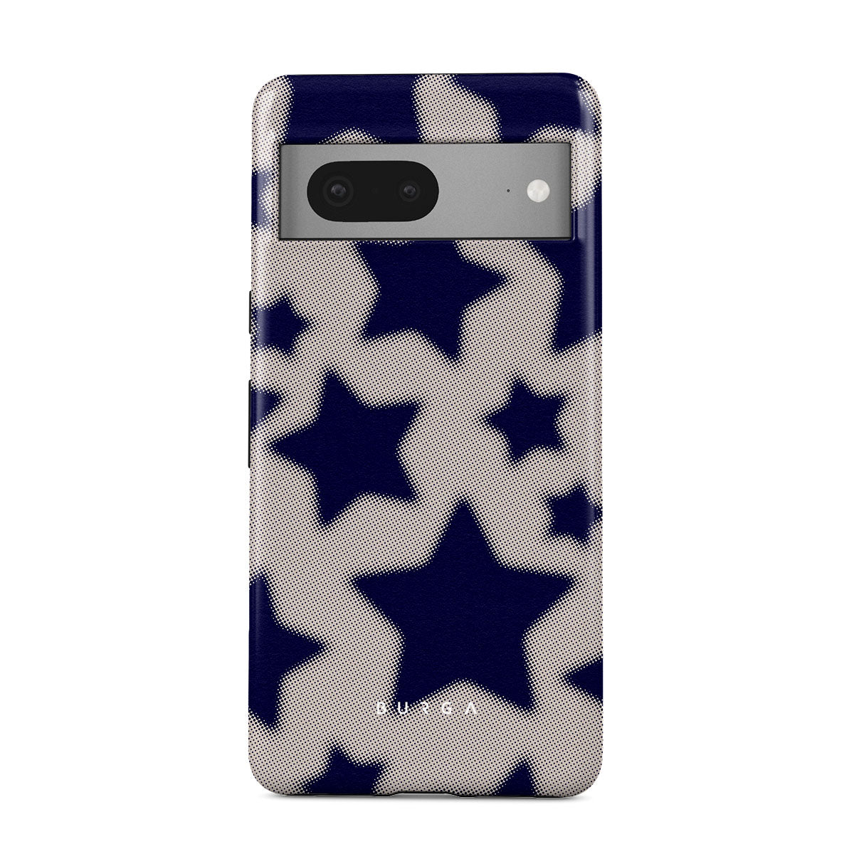 Rock a touch of '90s nostalgia with the Starstruck Google Pixel 7 phone case design. Its nude background is scattered with bold blue stars; each star hints at stories of hope and youthful dreams, blending simplicity with depth.