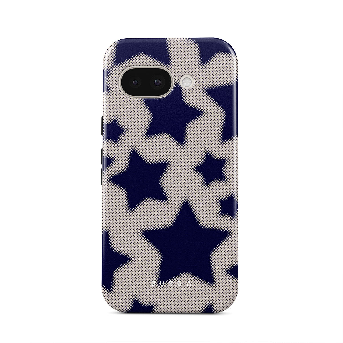 Rock a touch of '90s nostalgia with the Starstruck Google Pixel 9a phone case design. Its nude background is scattered with bold blue stars; each star hints at stories of hope and youthful dreams, blending simplicity with depth.
