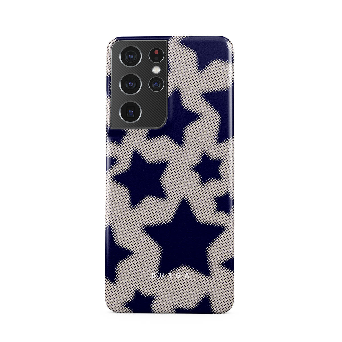 Rock a touch of '90s nostalgia with the Starstruck Samsung Galaxy S21 Ultra phone case design. Its nude background is scattered with bold blue stars; each star hints at stories of hope and youthful dreams, blending simplicity with depth.