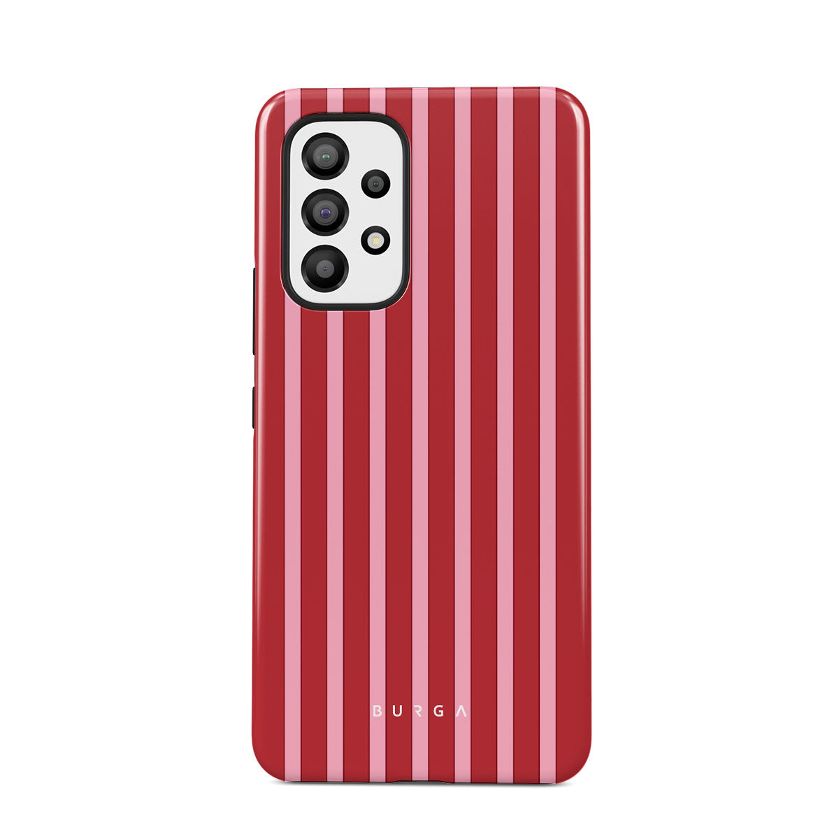 Stripes of red, like strawberry swirls on toast, this Samsung Galaxy A73 phone case design brings the sweet memory of breakfasts that start with a spread of homemade love.