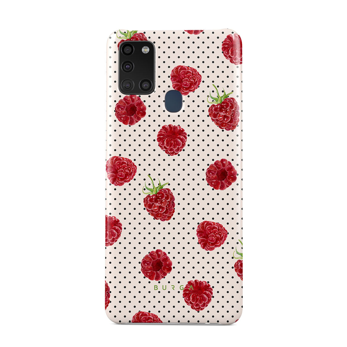 This Samsung Galaxy A21s 4G phone case design spills strawberries like secrets, the ones that taste of long days in the sun and remind you that some summers never end.