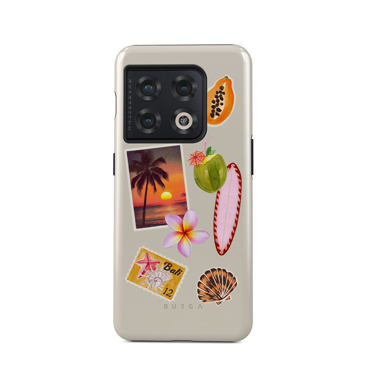 This design features: tropical sunset photo, papaya, green coconut, pink surfboard, pink plumeria flower, orange shell, Bali postcard