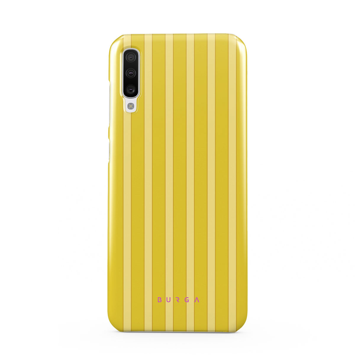 Bask in the glow of Sunbreak. This Samsung Galaxy A70 phone case design features bold yellow stripes, reminiscent of beachside cabanas and sunny summer days. It’s a chic celebration of joy and simplicity.