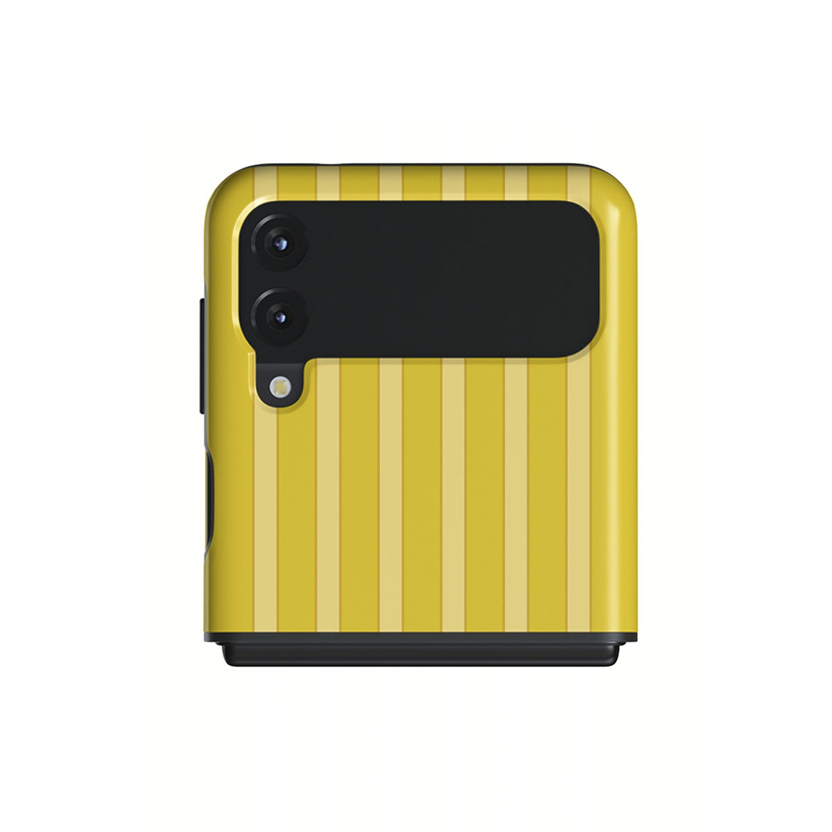 Bask in the glow of Sunbreak. This Samsung Galaxy Z Flip 3 phone case design features bold yellow stripes, reminiscent of beachside cabanas and sunny summer days. It’s a chic celebration of joy and simplicity.