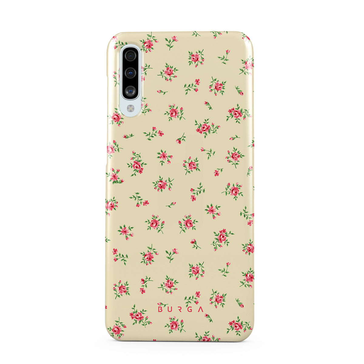 A daydream of soft pink petals on creamy yellow, reminiscent of that perfect light dress, twirling in the golden light of a lazy afternoon—that’s the Sundress Samsung Galaxy A50 phone case design.