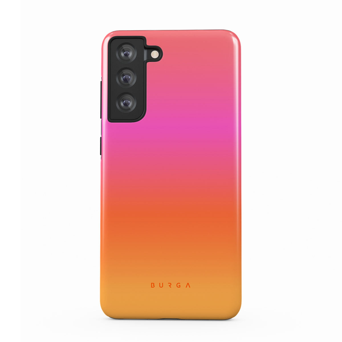 This Sunset Club Samsung Galaxy S21 FE phone case captures the mesmerizing hues of a fading sun, blending fiery oranges and passionate pinks that dance like the horizon at dusk. It's an everyday tribute to the light’s farewell kiss.