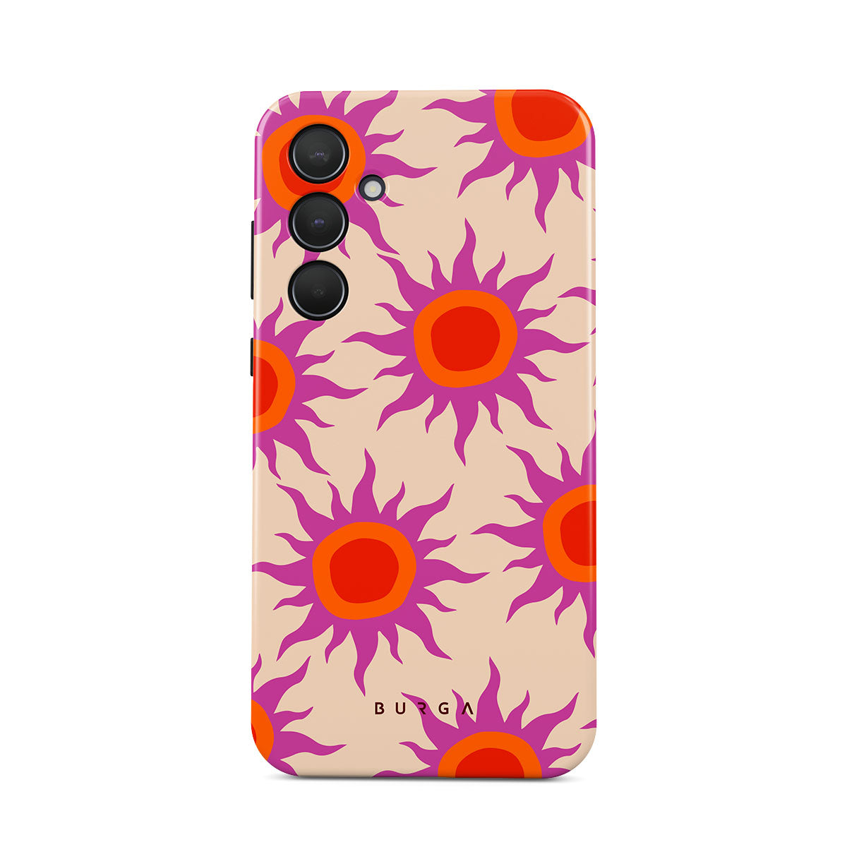 Discover the radiant serenity of the Sunset Glow design, a harmonious blend of soothing pastels and fiery suns. Vivacious viva magenta rays add a playful touch, perfectly balancing tranquility and dynamism. More than just a fashion accessory, this striking Samsung Galaxy A35 phone case mirrors your unique personality and zest for life.