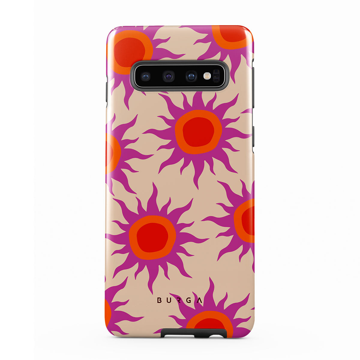 Discover the radiant serenity of the Sunset Glow design, a harmonious blend of soothing pastels and fiery suns. Vivacious viva magenta rays add a playful touch, perfectly balancing tranquility and dynamism. More than just a fashion accessory, this striking Samsung Galaxy S10 4G phone case mirrors your unique personality and zest for life.