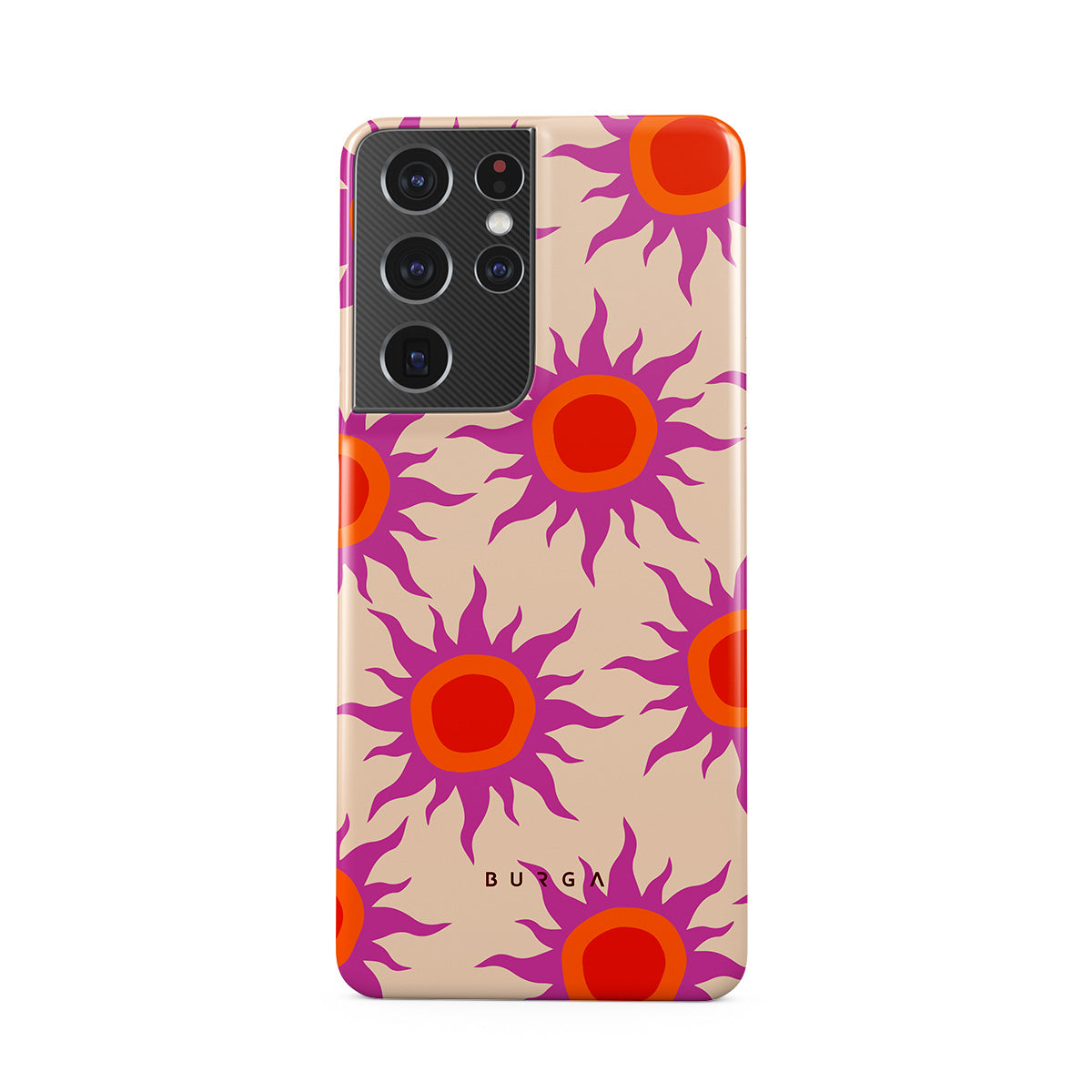 Discover the radiant serenity of the Sunset Glow design, a harmonious blend of soothing pastels and fiery suns. Vivacious viva magenta rays add a playful touch, perfectly balancing tranquility and dynamism. More than just a fashion accessory, this striking Samsung Galaxy S21 Ultra phone case mirrors your unique personality and zest for life.